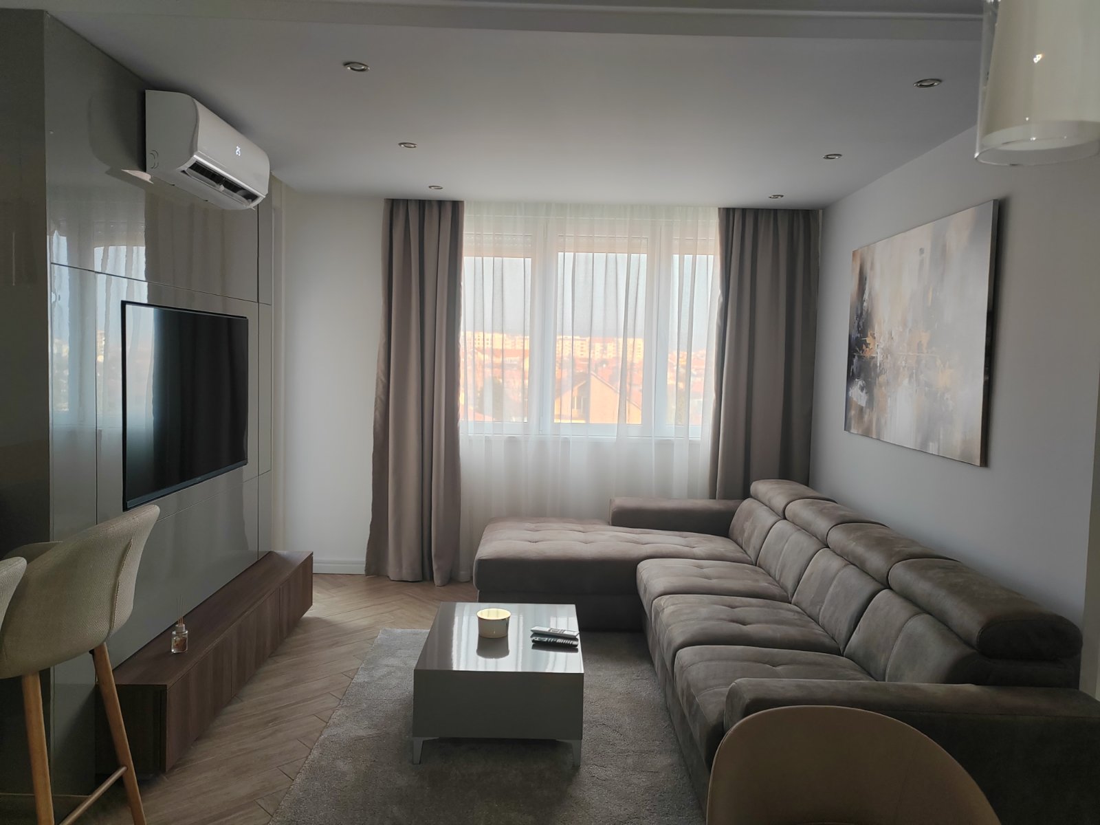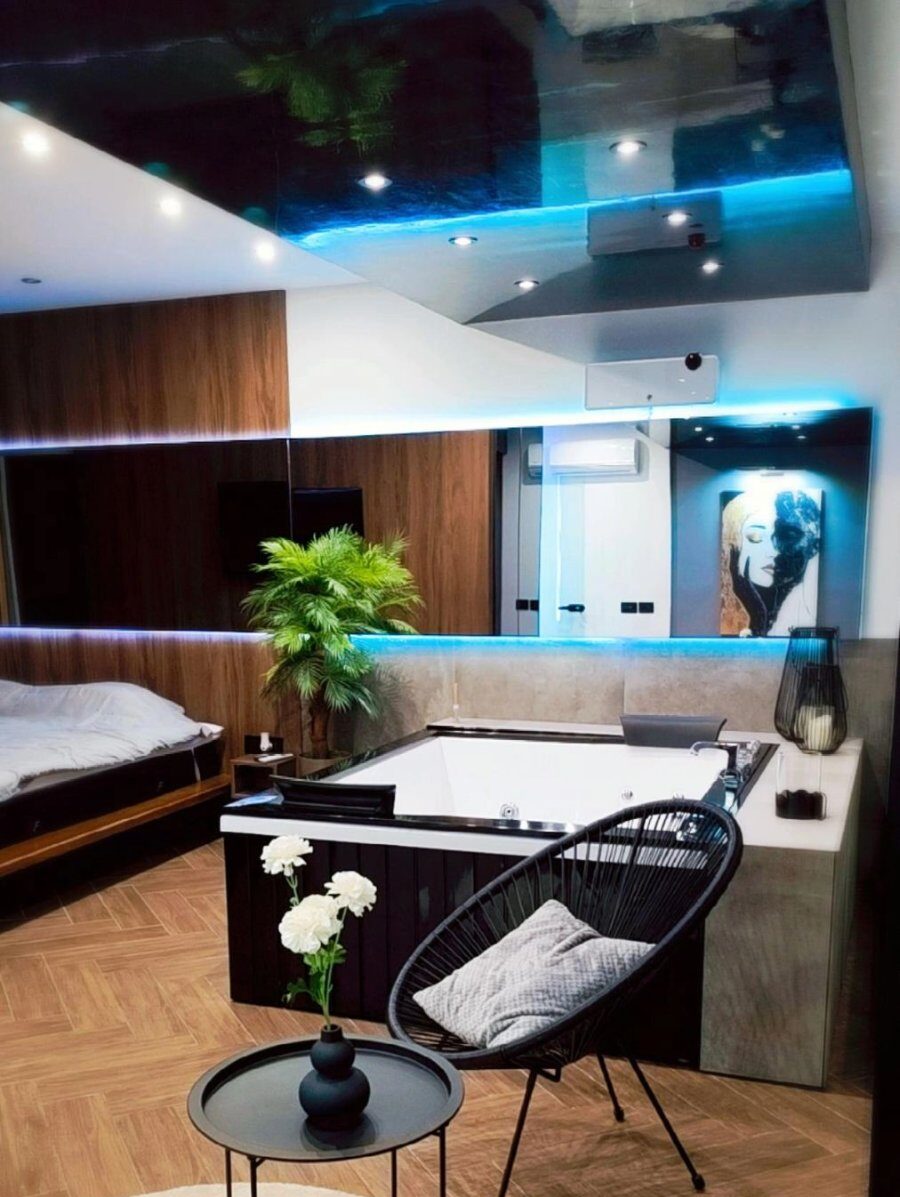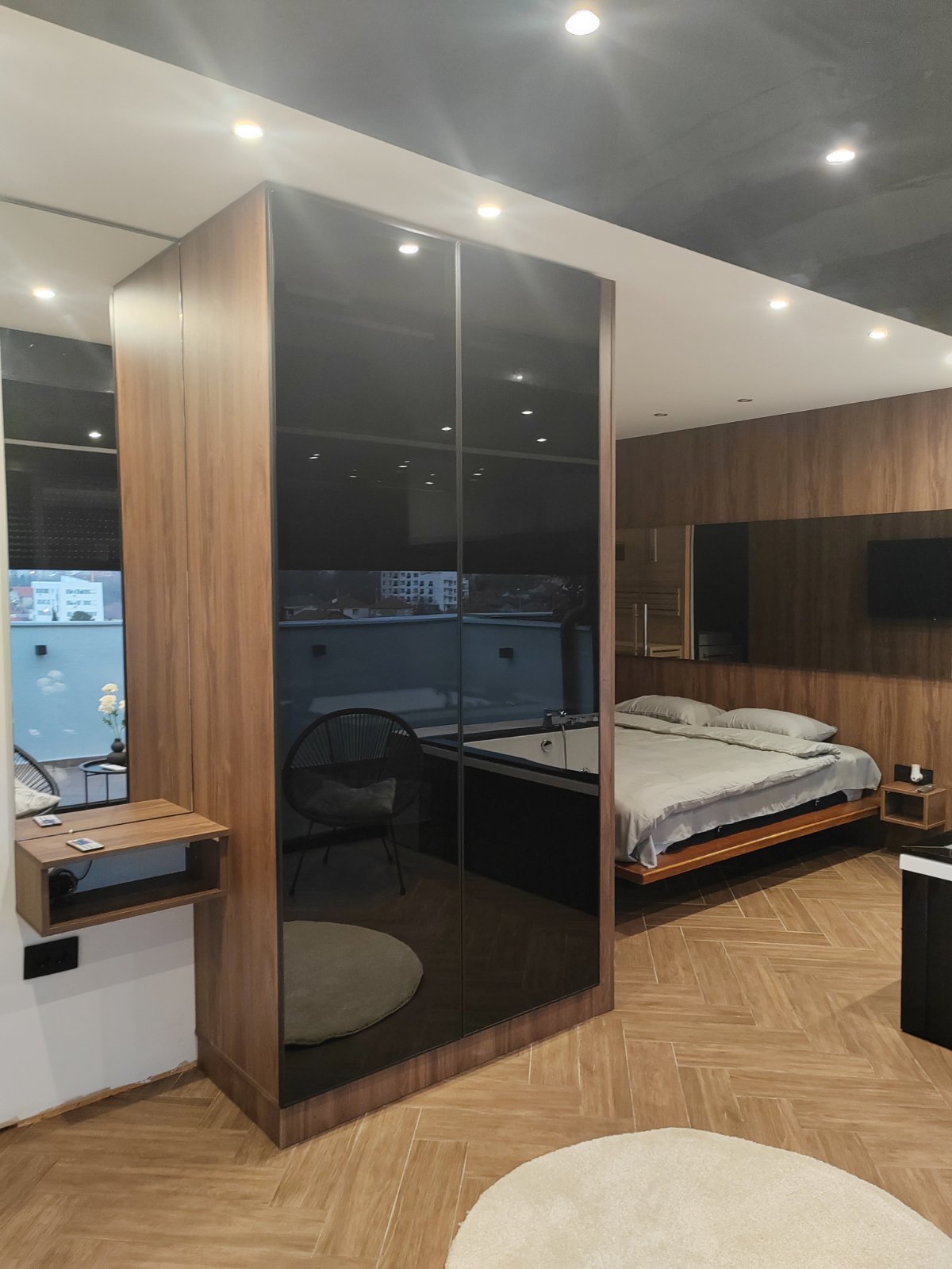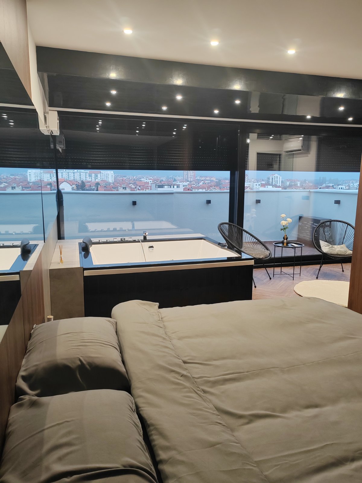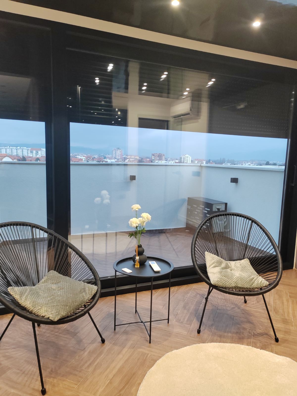 Apartman u duplex stilu sa dnevnim boravkom, kuhinjom i kupatilom na donjem nivou, dok gornji nivo nudi prostor za spavanje sa đakuzijem, saunom i dodatnim kupatilom. Terasa sa prelepim pogledom upotpunjuje osećaj luksuza i komfora.