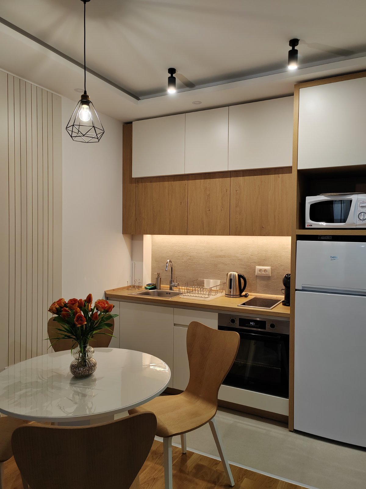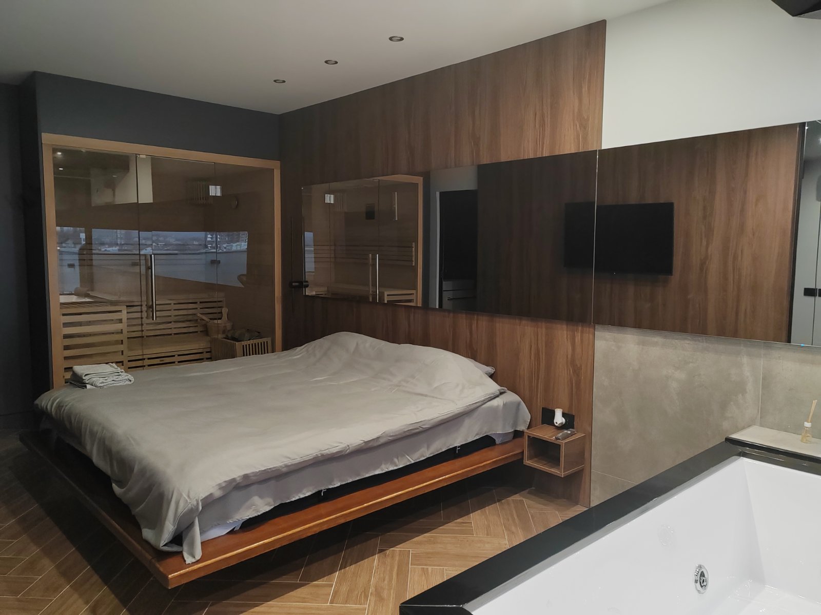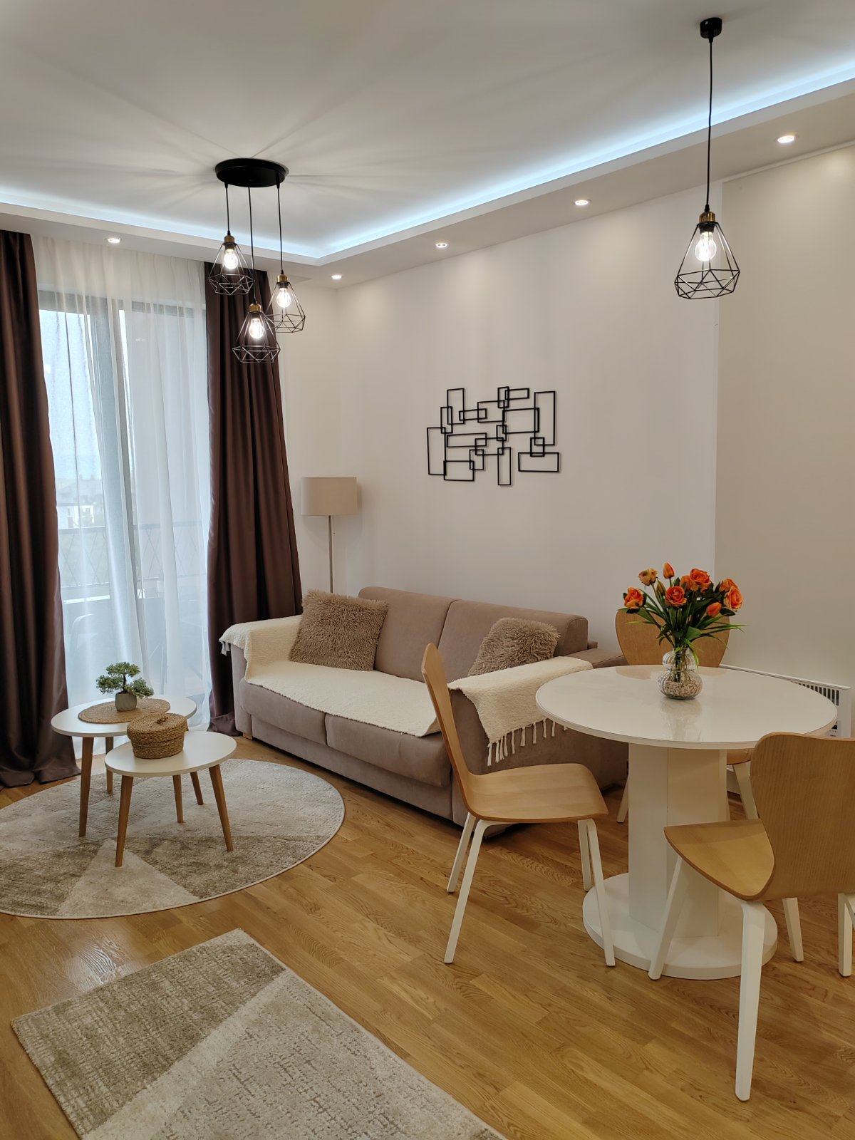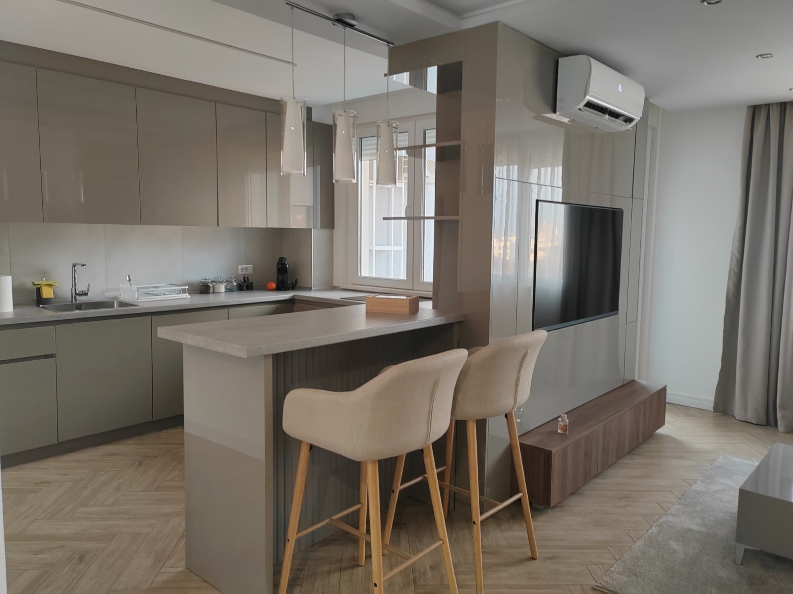 Apartman u duplex stilu sa dnevnim boravkom, kuhinjom i kupatilom na donjem nivou, dok gornji nivo nudi prostor za spavanje sa đakuzijem, saunom i dodatnim kupatilom. Terasa sa prelepim pogledom upotpunjuje osećaj luksuza i komfora.